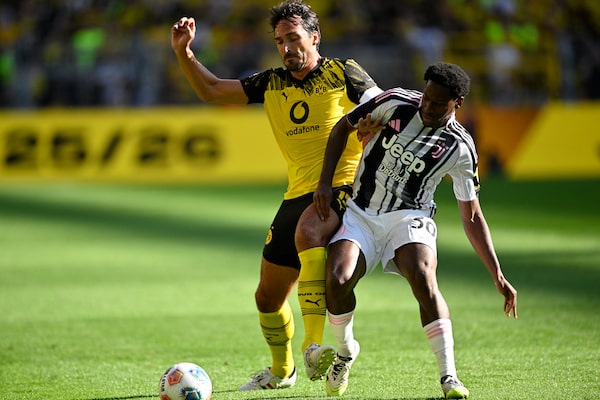 Juventus' Canadian forward Jonathan David, right, and Borussia Dortmund's Mats Hummels vie for the ball during a friendly match in Dortmund, Germany, this past Sunday.INA FASSBENDER/AFP/Getty Images