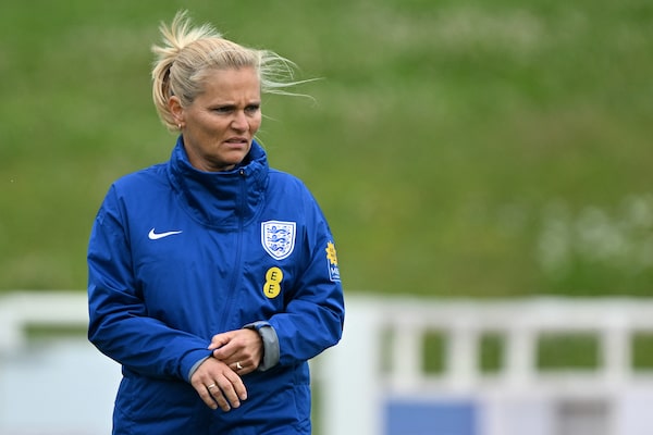 England's Dutch head coach Sarina Wiegman leads a team training session at St George's Park in Burton-on-Trent, central England, on June 27.JUSTIN TALLIS/AFP/Getty Images