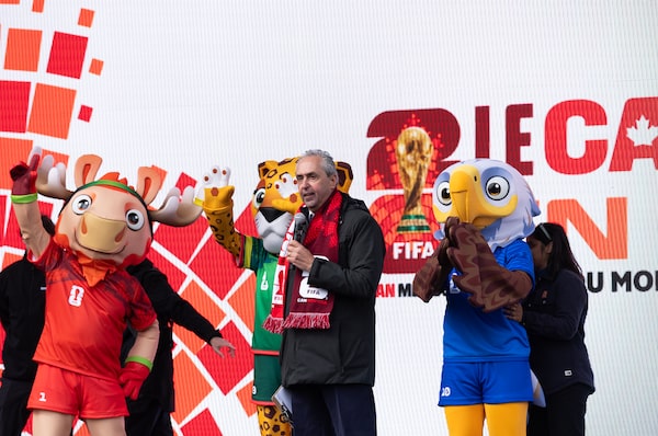 Chief Operating Officer Canada for FIFA Peter Montopoli is joined by mascots from left to right: Maple, Zayu and Clutch.CHAD HIPOLITO/The Canadian Press