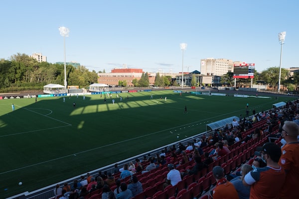 Soccer fans watch the York United FC and Forge Hamilton FC battle during CPL soccer action at York Lions Stadium in Toronto on July 30, 2021. Forge FC beat York United FC 1-0.Tijana Martin/The Canadian Press