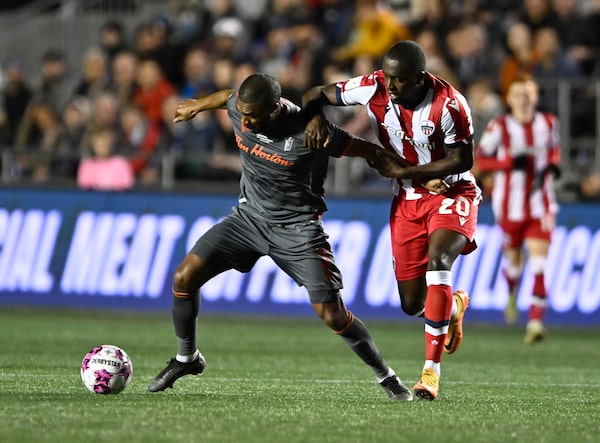 Forge FC's Ashtone Morgan battles for the ball with Atletico Ottawa's Abdoul Sissoko during a CPL game in Ottawa, on Oct. 30, 2022.Justin Tang/The Canadian Press