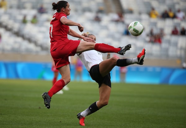 Former Canadian international Rhian Wilkinson, right, is leaving Soccer Canada.Eugenio Savio/The Associated Press