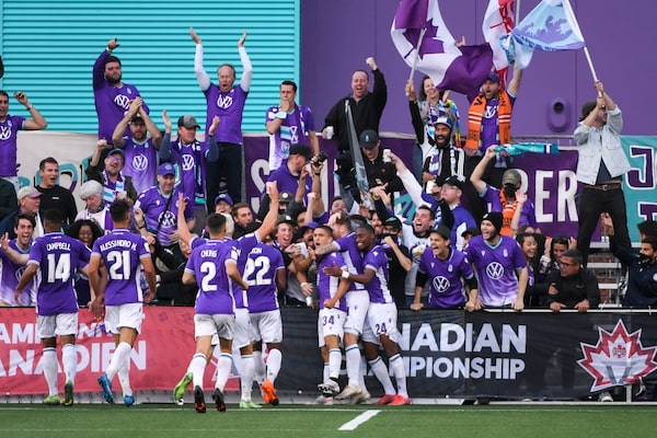 Pacific FC players celebrate after scoring a goal against the Vancouver Whitecaps, at the Starlight Stadium, in Victoria, on Aug. 26.Anne-Marie Sorvin/USA TODAY Sports via Reuters