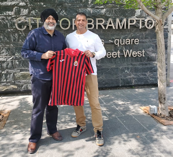 Canadian entrepreneur Steve Nijjar, right, and Brampton Deputy Mayor Harkirat Singh, hold a Racing Madrid FC jersey. Nijjar is co-owner of the Spanish team, which he hopes to help rise up from the lower tiers of Spanish soccer.HO/The Canadian Press