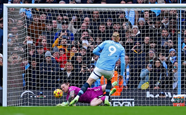 Manchester City's Erling Haaland has his penalty saved by Everton's Jordan Pickford. City and Everton tied 1-1 on Dec. 26, 2024.Craig Brough/Reuters