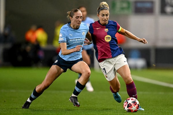 Manchester City's English defender Naomi Layzell vies for the ball with Barcelona's Spanish midfielder Alexia Putellas during the UEFA Women's Champions League Group D football match between Manchester City and Barcelona at the Joie Stadium in Manchester. Man City won 2-0 on Oct. 9, 2024.PAUL ELLIS/AFP/Getty Images