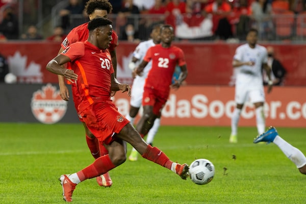 Canada's Jonathan David kicks the ball during the second half of a World Cup qualifying match against Panama on Oct. 13, 2021, in Toronto.Chris Young/The Associated Press