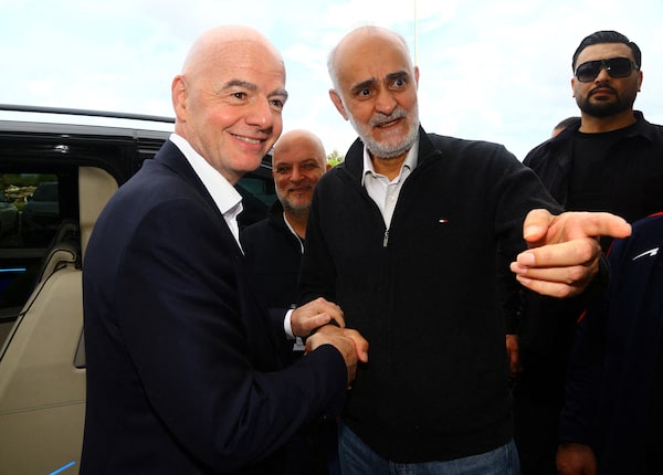 First vice president of the Islamic Republic of Iran Football Federation Mehdi Mohammad Nabi shakes hands with FIFA president Gianni Infantino before an Iran-Costa Rica friendly in Turkey on Tuesday.Kaan Soyturk/Reuters