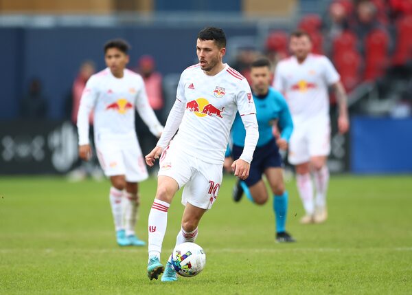 Lewis Morgan #10 of New York Red Bulls passes the ball during the second half of an MLS game against Toronto FC at BMO Field on March 5, 2022, in Toronto.VAUGHN RIDLEY/Getty Images