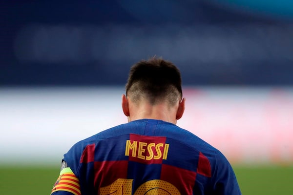 Barcelona's Lionel Messi stands on the pitch during a Champions League quarter-final at the Luz stadium in Lisbon on Aug. 14, 2020.The Associated Press