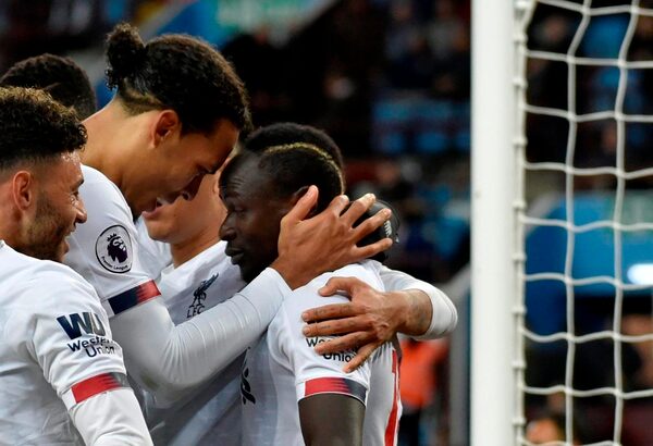 Liverpool's Sadio Mane, right, celebrates with teammates after scoring his side's second goal during the English Premier League soccer match between Aston Villa and Liverpool at Villa Park in Birmingham, England, Saturday, Nov. 2, 2019.The Associated Press