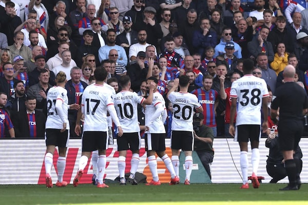 Liverpool's Diogo Jota, second from right, celebrates with teammatesafter scoring the opening goal during the English Premier League soccer match between Crystal Palace and Liverpool at Selhurst Park in London, Saturday, Oct. 5, 2024.Ian Walton/The Associated Press