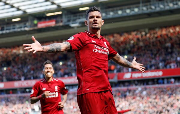 Liverpool’s Dejan Lovren celebrates scoring a goal against Brighton & Hove Albion, in Liverpool, Britain, on May 13, 2018.PHIL NOBLE/Reuters