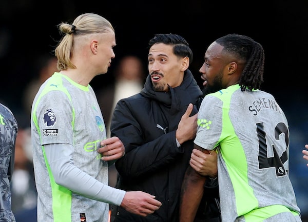 Manchester City's Tijjani Reijnders, Erling Haaland and Antoine Semenyo react after their win over Chelsea.Isabel Infantes/Reuters