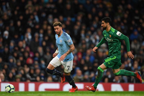 Manchester City's English defender Kyle Walker (L) controls the ball during the English Premier League football match between Manchester City and Watford at the Etihad Stadium in Manchester, north west England, on March 9, 2019.PAUL ELLIS/AFP/Getty Images