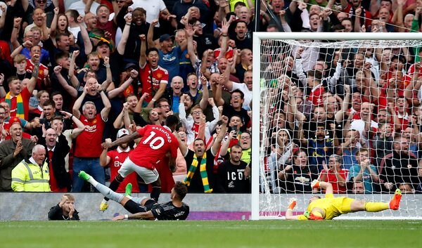 Manchester United's Marcus Rashford scores their third goal in Manchester, Britain on Sept. 4, 2022.CRAIG BROUGH/Reuters