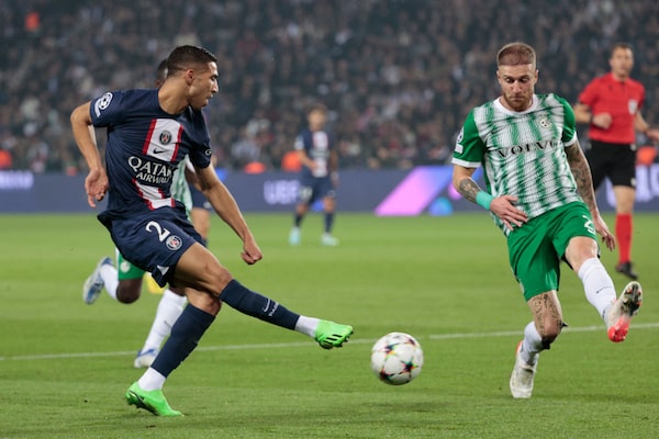 Paris Saint-Germain's Moroccan defender Achraf Hakimi kicks the ball during the UEFA Champions League Group H second leg football match between Paris Saint-Germain (PSG) and Maccabi Haifa FC at the Parc des Princes stadium in Paris. PSG won 7-2 on Oct. 25, 2022.GEOFFROY VAN DER HASSELT/AFP/Getty Images