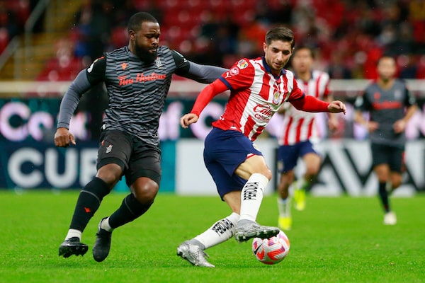Garven Metusala of Canada's Forge FC, left, and Isaac Brizuela of Mexico's Guadalajara battle for the ball during a CONCACAF Champions Cup soccer match in Zapopan, Mexico. Forge FC lost 2-1 on Feb. 13, 2024.Alfredo Moya/The Associated Press
