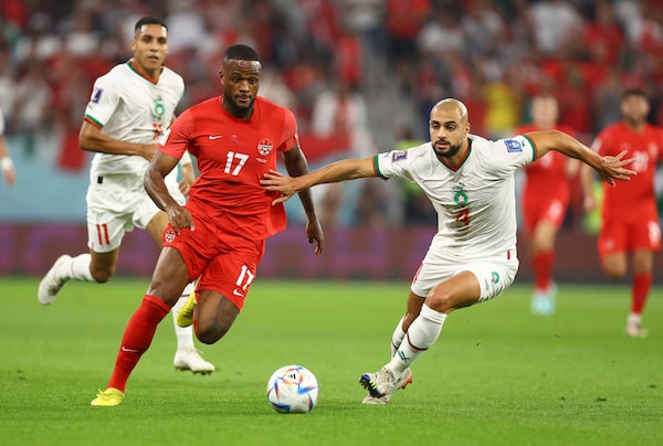 Sam Adekugbe threw Canada a lifeline in the 40th minute, beating a defender down the left flank and putting a ball in on goal that deflected off Aguerd’s outstretched foot past Bounou.