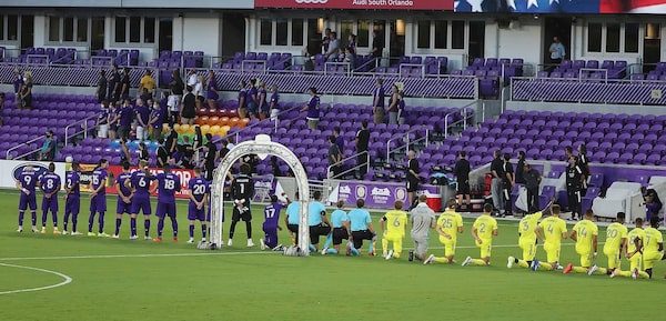 The entire Nashville SC team, right, kneels as Orlando City, left, with the exception of Nani (17), stands along with nearly every fan during the national anthem before an MLS soccer match in Orlando, Fla., Wednesday, Aug. 26, 2020.Stephen M. Dowell/The Associated Press