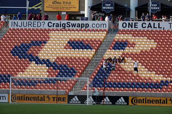A Real Salt Lake emblem is seen on seats at Rio Tinto Stadium, in Sandy, Utah, on Aug. 26, 2020.Jeffrey Swinger/USA TODAY Sports via Reuters