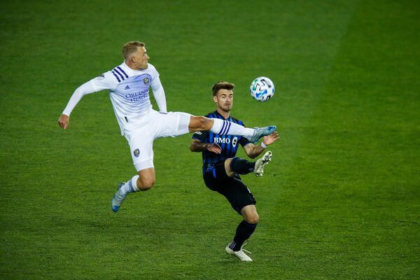 Orlando City defender Robin Jansson, left, and Montreal Impact midfielder Amar Sejdic battle for the ball during an MLS match, Sunday, Nov. 1, 2020, at Red BullArena in Harrison, N.J.Eduardo Munoz Alvarez/The Associated Press