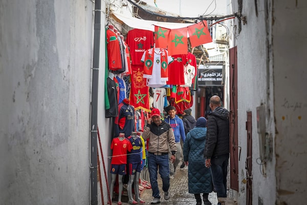 People walk past a sports apparel shop in Morocco's capital Rabat on December 13, 2022 a day ahead of the Qatar 2022 FIFA World Cup semi-final football match between Morocco and France.FADEL SENNA/AFP/Getty Images