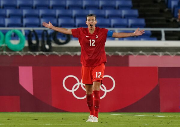 Canada's Christine Sinclair pleads for a penalty kick during the women's soccer gold medal game against Sweden at the Tokyo Olympics in Yokohama, Japan on Aug. 6, 2021.Adrian Wyld/The Canadian Press