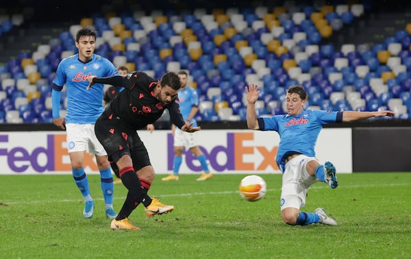 Real Sociedad's Willian Jose scores their first goal against Napoli in Europa League on Dec. 10, 2020.CIRO DE LUCA/Reuters