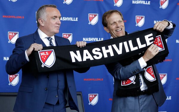 Ian Ayre, left, is introduced by John Ingram, right, the lead owner the Nashville MLS franchise as its first CEO on May 21, 2018, in Nashville.Mark Humphrey/The Associated Press