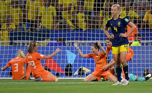 Members of the Dutch women's national soccer team celebrate their win over Sweden in a Women's World Cup semi-final match in Lyon, France, on July 3, 2019.PHILIPPE DESMAZES/AFP/Getty Images