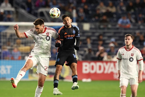 Toronto FC defender Shane O'Neill, left, and New York City FC forward Santiago Rodriguez contest a header during the second half at Yankee Stadium on Saturday, March 16, 2024.Vincent Carchietta/Reuters