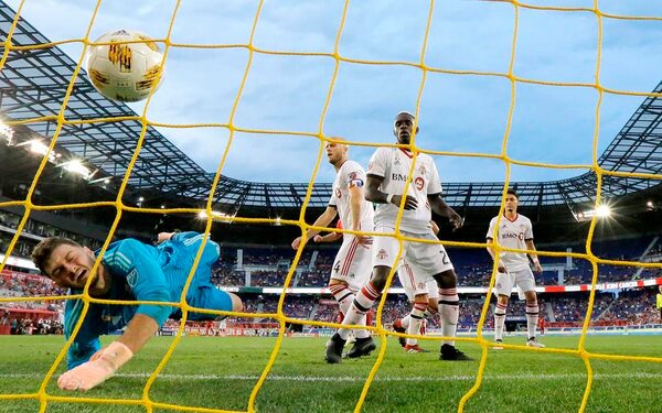 Toronto FC goalkeeper Alex Bono, left, dives but is unable to stop a scoring shot by New York Red Bulls midfielder Alejandro Romero Gamarra, not pictured, during the second half of a soccer game, Saturday, Sept. 22, 2018, in Harrison, N.J.Julio Cortez/The Associated Press