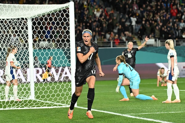 New Zealand's Hannah Wilkinson celebrates after scoring the opening goal during a Women's World Cup match against Norway, in Auckland, New Zealand, on July 20.Andrew Cornaga/The Associated Press
