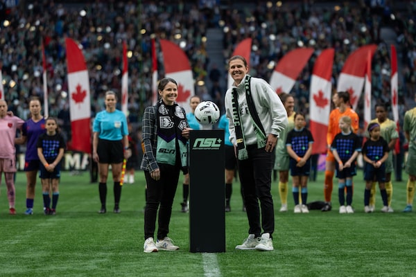 NSL co-founder Diana Matheson, left, poses for a photo with former Canadian national teammate Christine Sinclair, an owner of Vancouver Rise FC, before the league's debut match last April.ETHAN CAIRNS/The Canadian Press