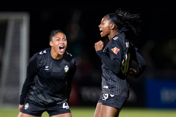 Vancouver Rise's Latifah Abdu, right, celebrates with teammate Jessika Cowart after scoring a goal against Ottawa Rapid FC during their semi-final match earlier this month.RICH LAM/The Canadian Press