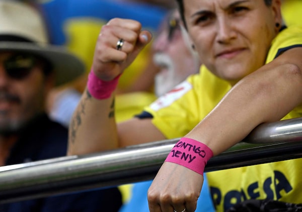 A supporter bears a wrist ribbon in support to Spain's midfielder Jennifer Hermoso amid widespread outrage over unsolicited kiss on her lips by president of Spain's football federation Luis Rubiales, prior the Spanish Liga football match between Villarreal CF and FC Barcelona at La Ceramica stadium in Vila-real on Aug. 27.JAVIER SORIANO/AFP/Getty Images