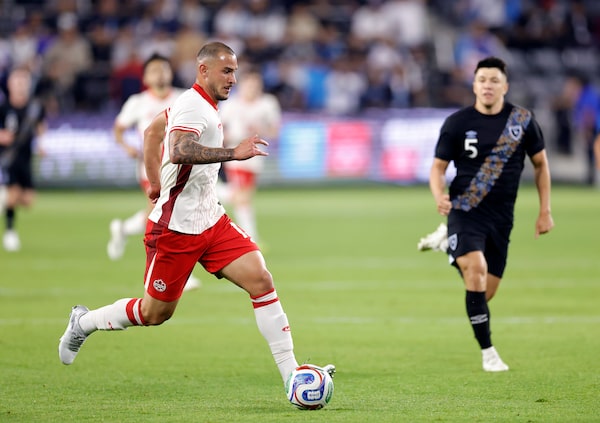 Tiago Coimbra (left) of Canada controls the ball in the second half of an international friendly at BMO Stadium on Saturday against Guatemala in Los Angeles.Ronald Martinez/Getty Images