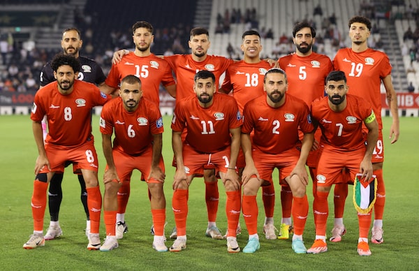 Palestinian players pose for a team group photo before a World Cup qualifying match against Lebanon, in Doha, Qatar, on June 6.Ibraheem Al Omari/Reuters