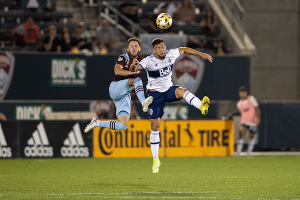 Colorado Rapids defender Keegan Rosenberry, left, and Vancouver Whitecaps FC forward Lucas Cavallini battle for the ball during the second half at Dick's Sporting Goods Park in Commerce City, Co., on Sept. 19, 2021.Isaiah J. Downing/USA TODAY Sports via Reuters