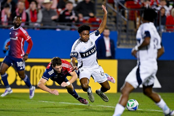 FC Dallas forward Logan Farrington (23) and Vancouver Whitecaps midfielder Ralph Priso (6) battle for control of the ball during the first half of their playoff game at Toyota Stadium earlier this month.Jerome Miron/Reuters