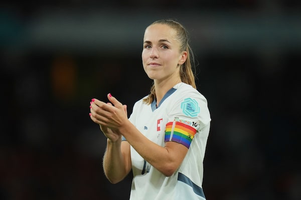 Switzerland's Lia Waelti, wearing a team captain rainbow armband, applauds the fans at the end of the Women's Euro 2025 quarterfinals soccer match between Spain and Switzerland at Stadion Wankdorf in Bern, Switzerland.Alessandra Tarantino/The Associated Press