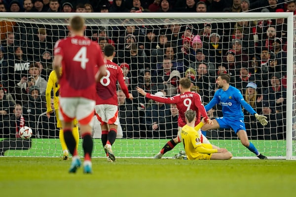 Manchester United's Rasmus Hojlund scores his side's third goal during the Europa League opening phase soccer match between Manchester United and Bodo Glimt, at the Old Trafford stadium in Manchester on Nov. 28.Dave Thompson/The Associated Press