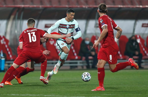Portugal's Cristiano Ronaldo, centre, in action during the World Cup 2022 group A qualifying soccer match between Serbia and Portugal at the Rajko Mitic stadium in Belgrade, Serbia, Saturday, March 27, 2021.Darko Vojinovic/The Associated Press