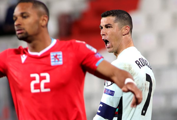 Portugal skipper Cristiano Ronaldo exults at the end of the 2022 Group A qualifying match against Luxembourg at the Josy Barthel Stadium in Luxembourg on March 30, 2021.Olivier Matthys/The Associated Press