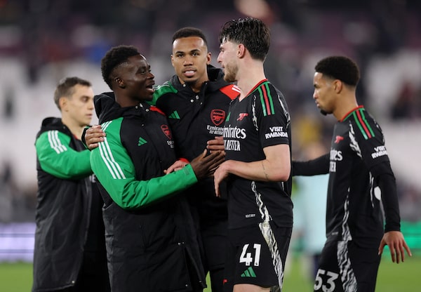 Arsenal's Declan Rice, Bukayo Saka and Gabriel Magalhaes celebrate after the match on Nov. 30.Hannah McKay/Reuters
