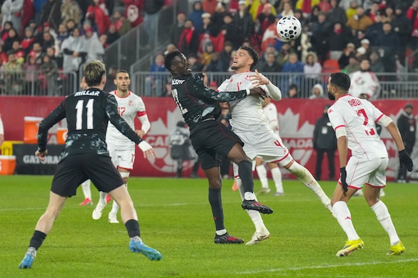 Canada's Tani Oluwaseyi, centre left, gets a header despite pressure from Tunisia's Omar Rekik, centre right, during first half of their friendly in Toronto, on Tuesday.Chris Young/The Canadian Press