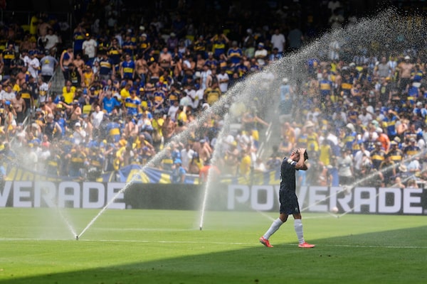 Auckland City's Gerard Garriga cools off under the sprinklers during a water break in the Club World Cup Group C soccer match between Auckland City and Boca Juniors in Nashville.George Walker IV/The Associated Press