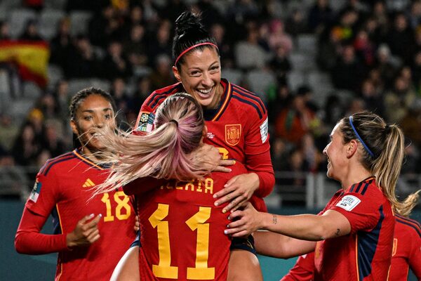 Spain midfielder Jennifer Hermoso celebrates with teammates after scoring a goal during a Women's World Cup match against Zambia, at Eden Park, in Auckland, New Zealand, on July 26.SAEED KHAN/AFP/Getty Images