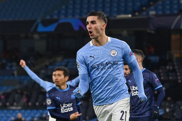 Then-Manchester City winger Ferran Torres celebrates after scoring a goal during a Champions League match against Marseille, at the Etihad Stadium, in Manchester, England, on Dec. 9, 2020.PAUL ELLIS/AFP/Getty Images